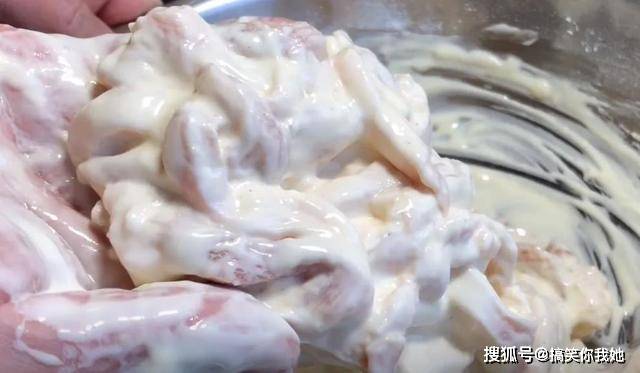 3、将里脊肉放在面糊中,裹上一层。