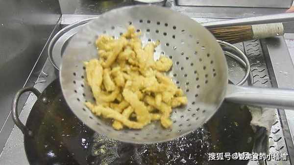 锅里倒入植物油,油烧五成热的时候,把腌好的里脊肉放入油锅炸一下,这个过程一直开中火,如果肉丝有粘连的,用勺子打散,把肉丝炸成金黄色的时候捞出控油。