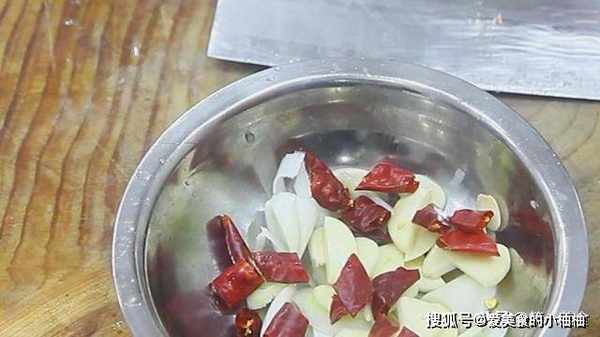 青椒红椒各半个,都切成丝,放盆中备用,大葱白一小段斜切成马蹄片,大蒜切成片,抓一把红干椒。