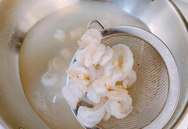 6、芦笋出锅之后,锅中的水不要倒掉,加入少许料酒去腥,下入虾仁,把虾仁也焯一下水,虾仁焯水的时间要掌握好,虾仁下锅,颜色发生变化,虾仁微微卷曲,大约10s钟左右,马上出锅,两种食材都焯水,能最大程度保证这道菜脆嫩的口感。