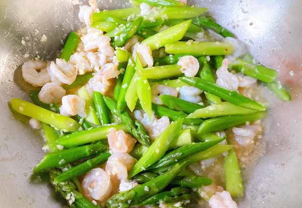 8、锅烧热,加入适量的橄榄油,下入蒜末,翻炒出香味,下入虾仁和芦笋,大火爆炒,翻炒均匀之后,马上加入准备好的料汁,把调料都翻拌均匀之后,马上出锅,翻炒的时间不能太久,翻拌均匀就可以出锅了。