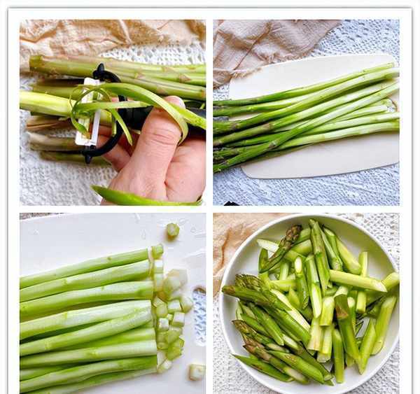 2、芦笋根部的外皮是一层粗纤维,不太好消化,而且吃的时候会有一口渣,所以家庭烹饪芦笋的时候,需要将根部的皮削去,这样吃的时候口感会更好,去皮之后清洗干净,根部切掉一些,再斜切成段。