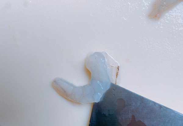 3、芦笋处理好之后,处理虾仁,虾仁清洗干净之后,用刀在背部划上一刀,把虾线处理干净,背部划上一刀还有其它的好处,这样炒出来的虾仁会更入味,翻炒出来的形状也会更好看。