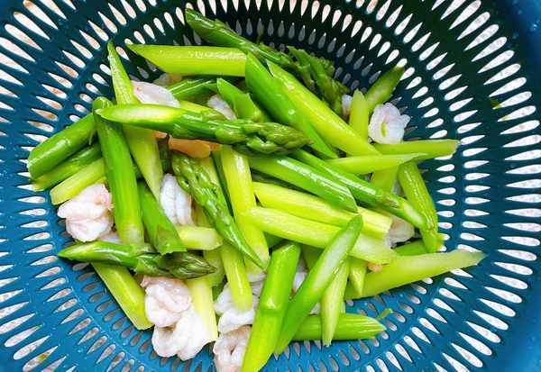 7、把芦笋和虾仁放在一起,过凉之后,沥干水分,所有食材都处理好之后,开始翻炒。