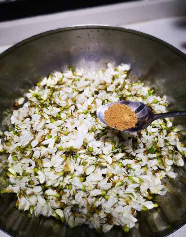 2、将沥干水的槐花放入盆中,加少许盐和五香粉拌匀。(这一步和味最重要,只需少许增加底味不宜过多,不然会抢了槐花本身的清甜味。)