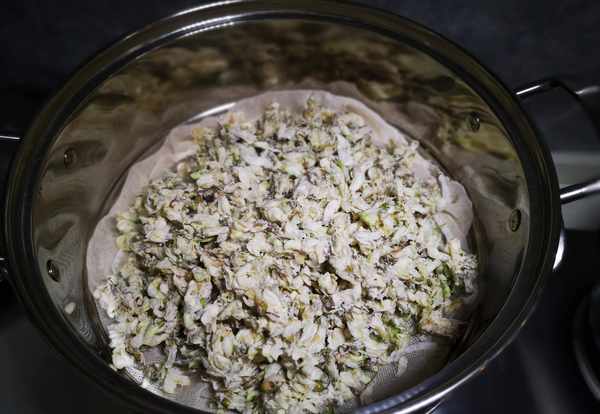 1、将槐花用清水淘洗三遍,沥干水分。(注意力度不要太大,不要用力捏压花朵)