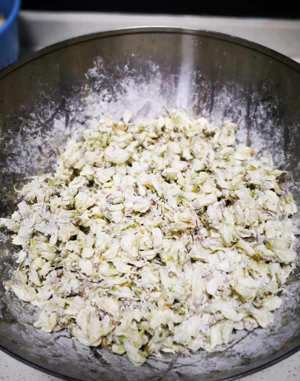 3、少量多次加入面粉,让面粉刚好充分裹满每一朵槐花。(面粉一定要弄均匀。)