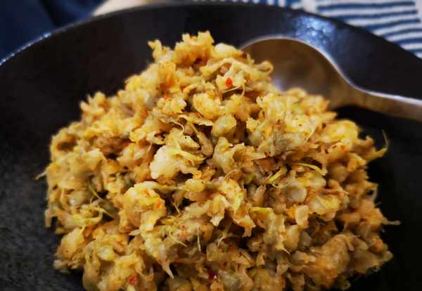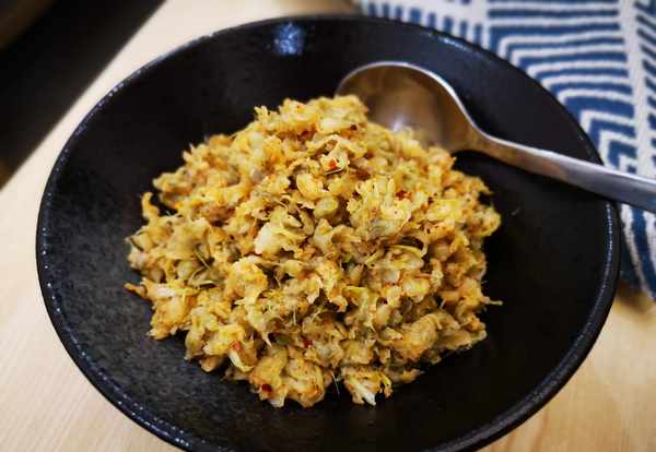 6、根据口味加入油泼蒜拌匀,如果不吃辣椒,也可以直接在蒸好的麦饭里加生蒜末和芝麻油,是另外一种风味,也是超级好吃。