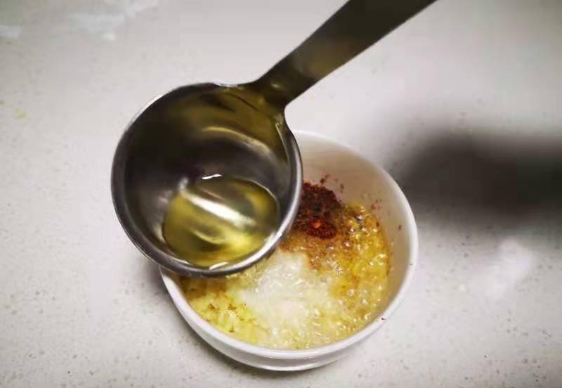 5、趁蒸麦饭的时间,准备蒜末和辣椒面,淋入热油后,加适量盐和芝麻油和匀。
