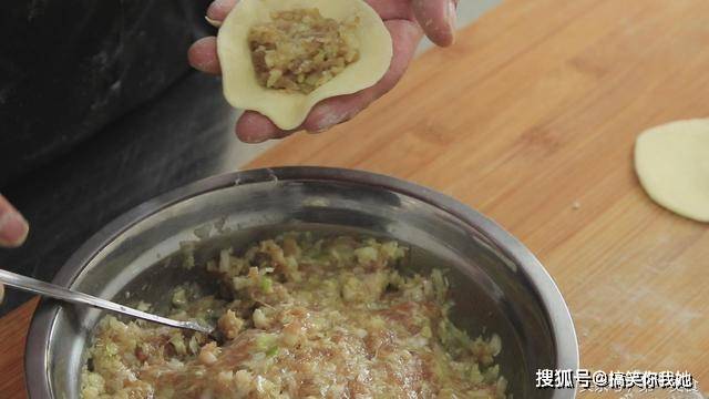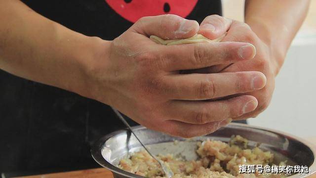 我们取出饺子馅 ,拿一个小勺子把饺子馅放在饺子皮上,用双手的虎口挤出非常漂亮的饺子来。