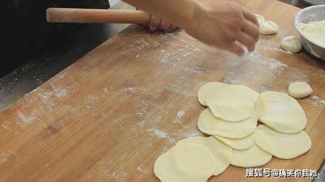 拿起面剂子一个一个都用擀面杖擀成中间稍厚四周比较薄的饺子皮,饺子皮不要擀的太大