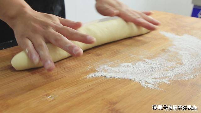 10分钟以后,在案板上面撒上面粉, 取出面团 ,搓揉成长条。