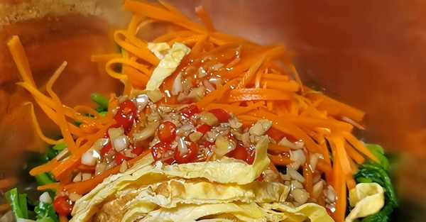 1.准备一个小碗,打入两个鸡蛋,搅成均匀的鸡蛋液。锅烧热后放倒入鸡蛋液,将鸡蛋煎成饼状,再将鸡蛋饼切成细丝。
