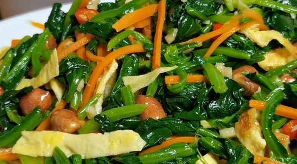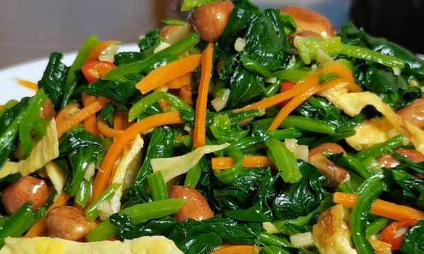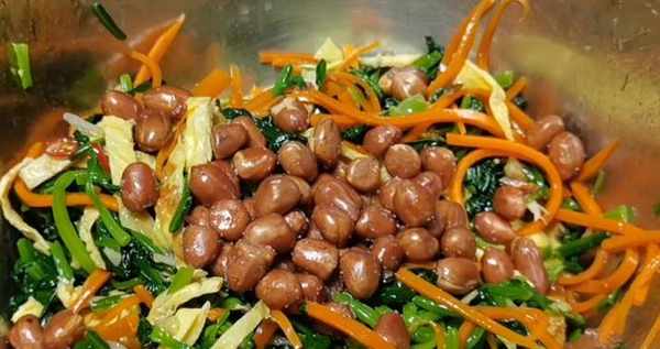 5.准备一个大碗,放入胡萝卜丝、菠菜段、鸡蛋丝、熟花生,倒入调味汁,用手轻轻抓拌均匀,装入盘中就做好了。