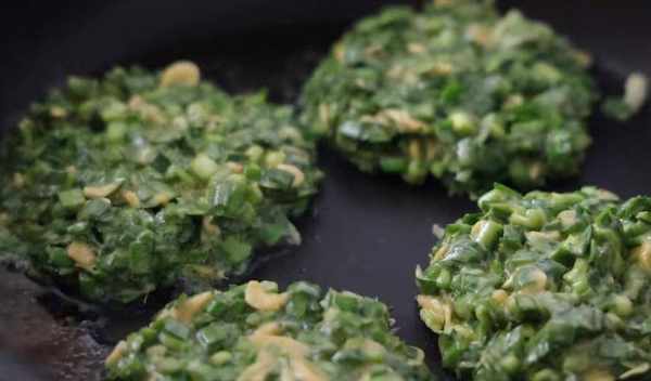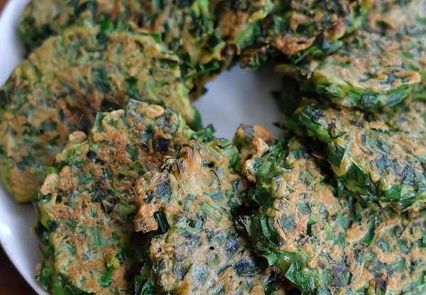 3.准备一个平底锅烧至八成热时倒入油涂抹均匀。放入一勺韭菜鸡蛋液,煎至定型后翻面。继续煎,直至将两面煎成金黄色后就做好了。