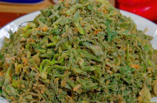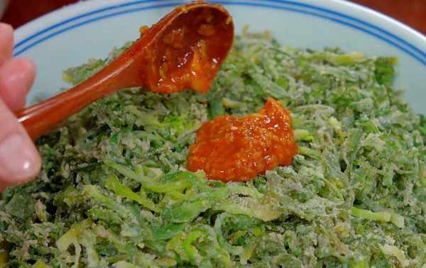 5.将蒸好的荠菜取出,用手将荠菜抓散,再将荠菜放入盘中,倒入调味汁,翻拌均匀就做好了。