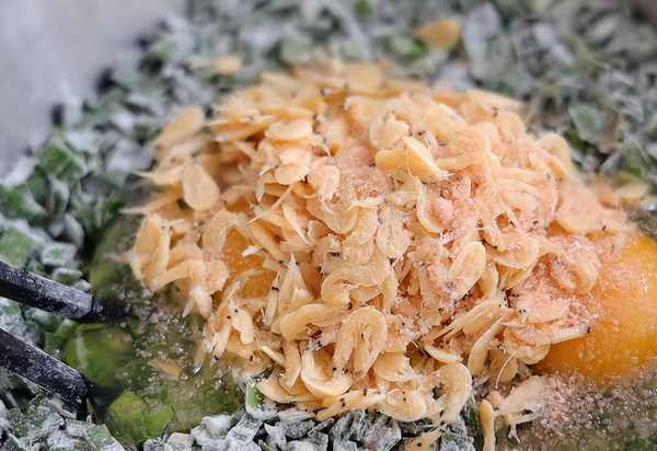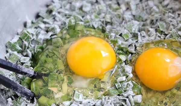 2.准备一个大碗,放入韭菜碎,再加入面粉搅拌均匀。打入两个鸡蛋。加小半碗虾皮,少量胡椒粉,五香粉搅拌均匀。