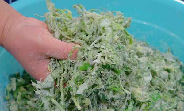 2.准备一个大盆,放入荠菜,加入半碗面粉,半碗玉米粉,用手抓均匀,使荠菜面均匀的裹上粉。