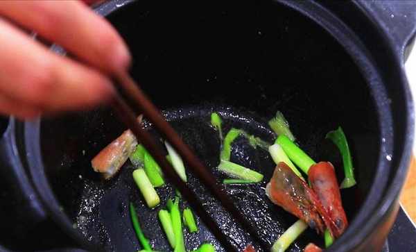 3.砂锅烧热,加入少许底油,放入虾头和葱段,开小火煎一会,煎出虾油、把葱段爆香。