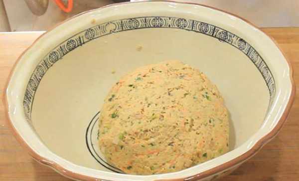 2.把打好的豆渣、沥出豆汁倒入盆中晾凉,然后加入一勺面粉、一勺玉米面,适量的胡萝卜丝和葱花,再放盐、鸡粉调味,再加入5克酵母和成面团,发酵至原来的两倍大。