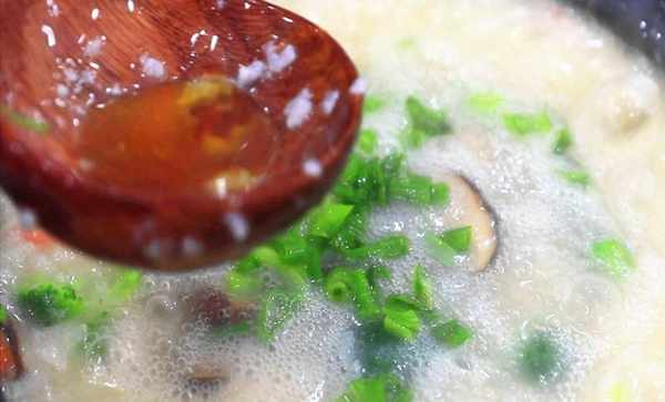6.最后撒上葱花、淋上香油,清香可口、营养好消化的鲜虾粥就能出锅食用了。