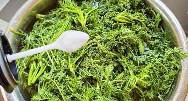 第一步:摘回家的麦蒿,将它的根部、枯叶和干叶全部去掉,取一个盆,加入适量的清水,少加一点盐,搅拌均匀,将麦蒿放在淡盐水内,浸泡10分钟后,用流动的清水清洗干净。