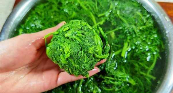 第二步:锅内加水,烧至冒小泡后,将清洗干净的麦蒿放入锅中,搅动一下,使其受热均匀,将麦蒿焯熟后捞出,挤一下水分,放到案板上,用刀剁碎备用。
