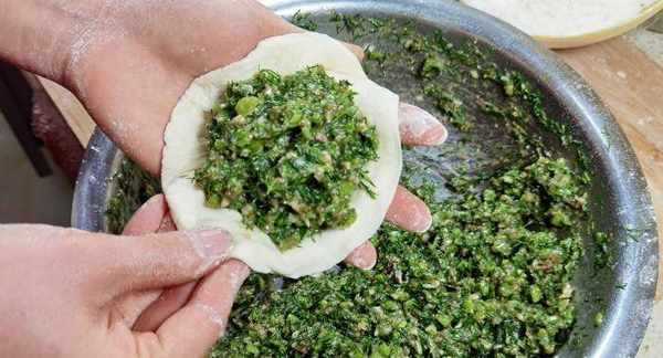第五步:将发好的面取出,放在案板上,揉一下,给面排气,然后搓成长条,切成大小均匀的面剂,先用手按压一下,再用擀面杖将面剂擀成中间厚,四周薄的面皮。取一个面皮托在手中,舀入适量的菜馅,像包包子一下将面皮收口,将菜馅包起来,按压成饼。