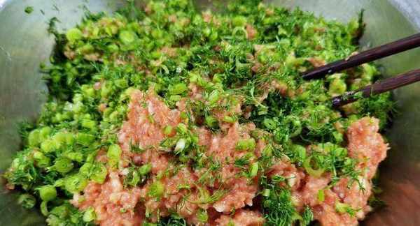第三步:取适量的五花肉,剁成肉馅后,装入盆中,加入适量的葱末、姜末、盐、生抽、蚝油、香油,朝一个方向搅拌,搅拌至肉馅上劲后,腌制10分钟,再将剁碎的麦蒿放入盆中,加入适量的食用油和盐,搅拌均匀,菜馅就调好了。