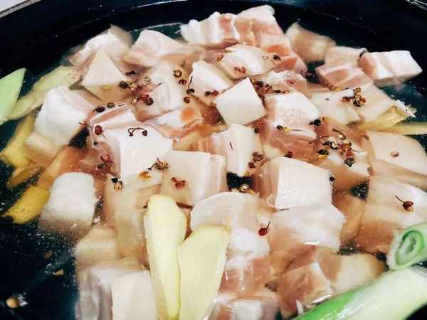 面团醒发的过程中,我们准备两分肥八分瘦的猪肉就可以了。然后将其切成两厘米左右的小四方块备用。将其切成小块之后,炒锅中加入适量的清水,然后将准备好的肉块放入里面,加入老姜几片去香,加入料酒几滴。将其大火煮开,然后煮五分钟捞出晾凉备用。