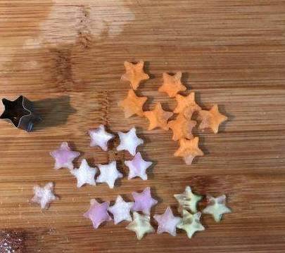 5、用模具切出星星造型,胡萝卜、黄瓜、洋葱等各种。6、将各色小星星摆上。
