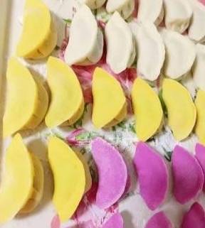 彩色饺子,材料全部都是采用天然的蔬果汁做的,健康美味,小孩也喜欢吃,过年做起来吧~