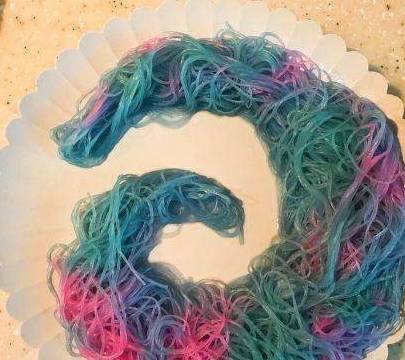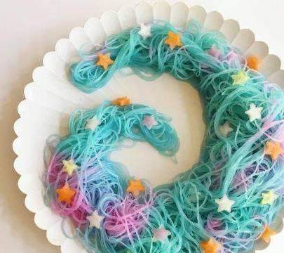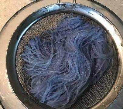 3、粉丝捞出沥干水分,变蓝色啦。4、用苏打水滴在粉丝上会变成蓝绿色,寿司醋滴在粉丝上会变成玫红色。
