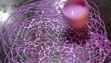 2、用一个底部有洞的勺子,然后把面糊倒进勺子上,随后快速的在铁锅上面画圈圈,之后我们就看见了这种形状的小吃。