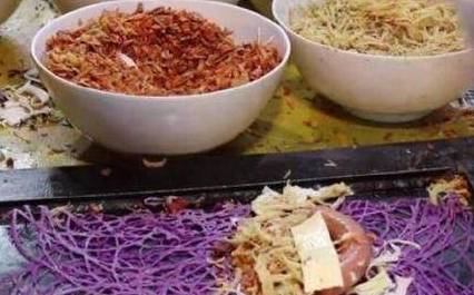 3、然后用铁铲子翻面,两边折叠到中间,手法一定要迅速。然后就是放一点食材,这里有火腿肠、咸菜末、一些豆皮之类的调料。这种小吃比春卷更加丰富,口感一点都不输给春卷。基本上3分钟就搞定了这道小吃,如果生意好的话,可想而知。