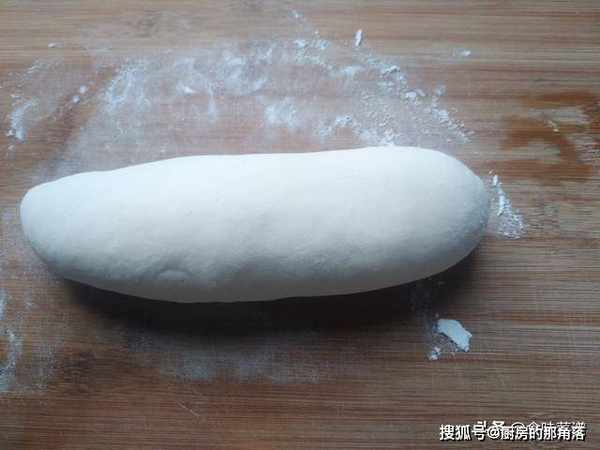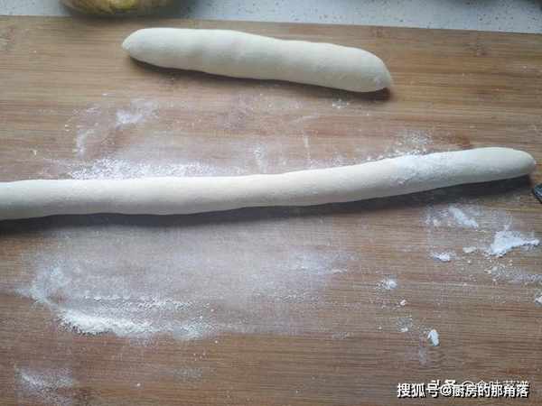 在撒一些面粉,控制面粉量,一次不要太多,把面团揉成长条形。