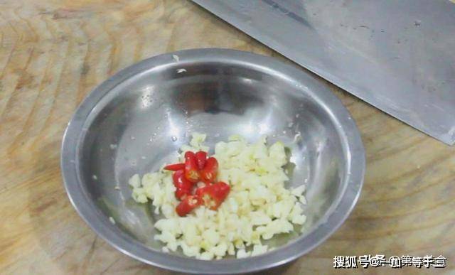 4.准备小米椒两个,先切成圈,然后和蒜末放在一起,置于盆中。