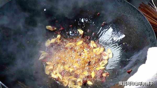 6.锅内烧油,把油烧热,撒入少许青花椒,一小把干辣椒,倒入切好的葱姜,爆出香辣味,加入豆瓣酱10克,火锅底料30克,快速把酱料炒散炒出红油,把底味提香。