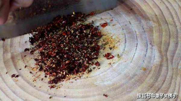 4.下面我们开始制作刀口辣椒,锅内烧油,油温烧至5成热时转小火,放入一小把干辣椒、一小把青花椒,炒出其中的水分,辣椒花椒变成焦褐色,质地发脆后,迅速出锅摊开放凉,放凉之后辣椒花椒变得又香又脆,用刀口摁压成碎末以后刀口辣椒就做好了。