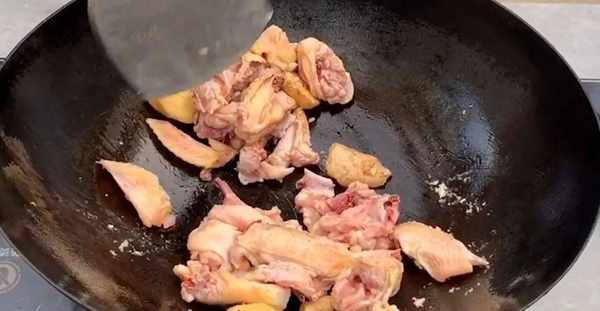 4.我们把锅烧至冒青烟,下入姜块。再倒入少许花生油,然后把这个鸡肉下入锅里。开猛火,翻炒一下。这样炒呢,能去除鸡肉的腥味啊,增加它的香味,它的水分啊,稍稍的炒干。把它炒的有点干了,