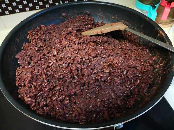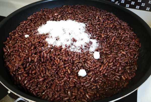 3、正常情况下,泡好的红豆煮半个小时就会熟透,这时候加入适量的白糖搅拌均匀,再继续焖5~10分钟,然后开锅后大火翻炒收汁,盛出即可。