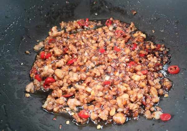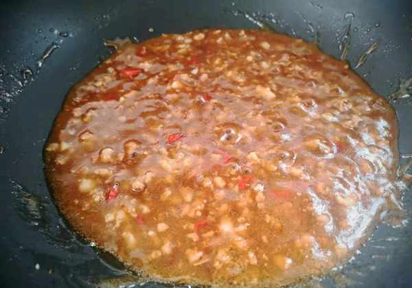 3.煎锅加入油,加热。加入小米椒和蒜末炒香。然后加入肉末翻炒至颜色变白。倒入少许料酒、一勺生抽、少许鸡精,炒至肉末在上面。颜色。