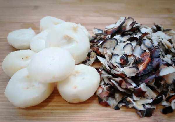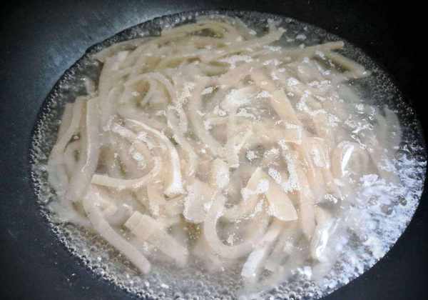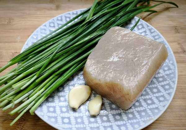 2、韭菜洗净切段,放入盘中,大蒜切块,大蒜魔芋洗净,切片后切成细条,用水焯5分钟去碱闻闻,取出并控制水分。