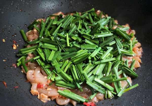 4、韭菜炒至微软变色,加入少许盐,生抽2勺,大火炒至韭菜碎,装盘。