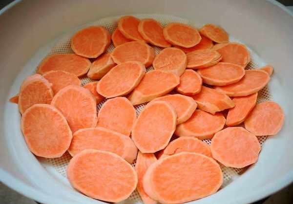 1.准备2个红薯。这种红薯水分少。红薯用水洗净,去除表面泥土,剥去外皮,切成薄片。放入蒸锅蒸10分钟。用筷子轻松戳破,蒸熟就完成了。.