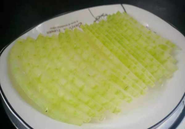 2.一张叠一块放在盘子里,盘子随意排列,锅里加水烧开,把盘子的一半放在蒸笼上,大火蒸10分钟,取出,把冬瓜盘里的水倒掉。