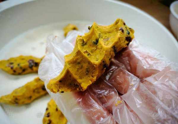 3、戴上一次性手套,取适量面团于掌心,握紧,定型。是不是很简单?全部搞定后,均匀的放在蒸盘上,盖上盖子,大火蒸10分钟。你可以把它从锅里拿出来,拿出来放凉一会,味道浓郁香甜。