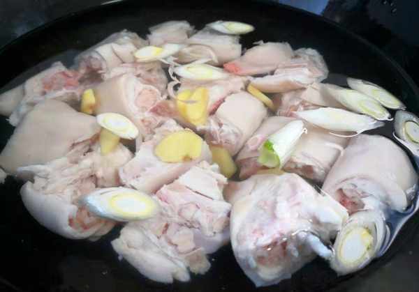1.准备2只前腿猪蹄,用刀刮去剩余的猪毛,冲洗干净,从中间劈开,剁成均匀的大块,把剁碎的猪蹄放入盆中,加入少许面粉他们,用手抓搓猪块中的杂质和血水,然后冲洗干净,沥干水分。锅内加入适量清水,放入猪蹄,加入适量姜片、葱段,倒入少许料酒焯5分钟,捞出,用温水洗净。