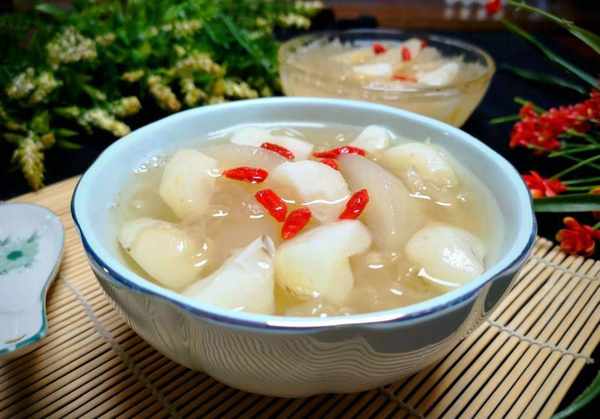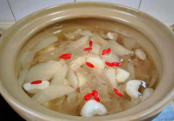 3、将银耳放入砂锅中,加入适量清水,煮沸后转小火炖约1小时。将银耳煮至粘稠,加入梨块、荸荠和冰糖继续炖15分钟,待汤汁炖熟后,加入少许枸杞,小火炖几分钟。方法简单,老少皆宜。