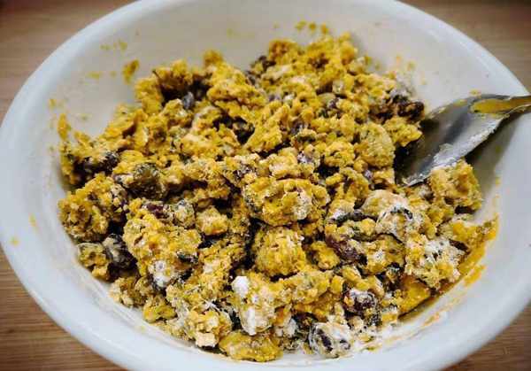 2.蒸出来的南瓜很软烂。倒入碗中,用擀面杖擀成泥,然后加入淀粉。你不需要加太多淀粉。淀粉的量根据南瓜的量而定,然后加入准备好的蜜豆。搅拌至顺滑,用手能握住即可,揉成面团。